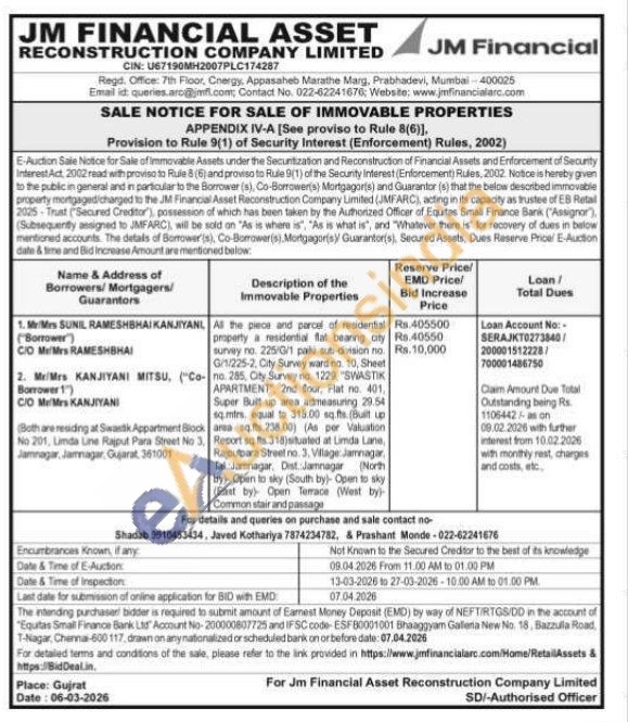 As the piece and parcel of residential property a residential flat beanng city survey no. 225/3/1 paiki sub-division no G/1/225-2, City Survey ward no. 10, Sheet no. 285, City Survey no 1229, "SWASTIK APARTMENT", 2nd floor, Flat no. 401, Super Bult up ansa admeasuring 29.54 sq.mtrs equal to 318.00 sq the (Built up area sq.fts.238.00) (As per Valuation Report sq fts 318)situated at Linda Lane, Rajputpara Street no. 3, Village Jamnagar, Tal Jamnagar, Dist. Jamnagar (North by Open to sky (South by Open to sky (East by) Open Terrace (West by Common stair and passage