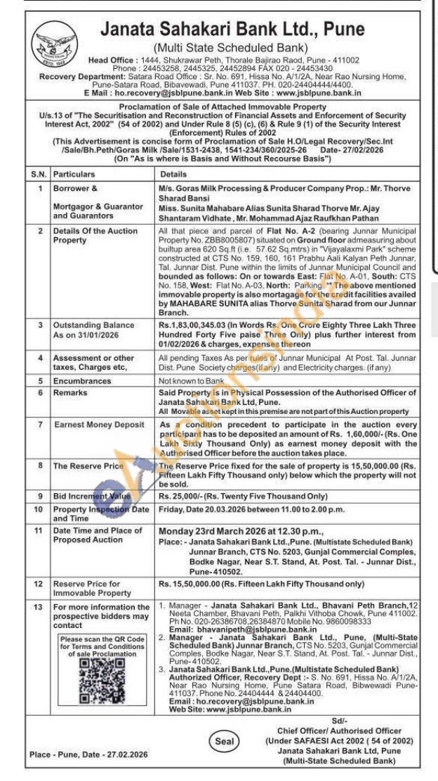 All that piece and parcel of Flat No. A-2 (bearing Junnar Municipal Property No. ZBB8005807) situated on Ground floor admeasuring about builtup area 620 Sq.ft (e. 57 62 Sq.mtrs) in "Vijayalaxmi Park" scheme constructed at CTS No. 159, 160, 161 Prabhu Aali Kalyan Peth Junnar, Tal. Junnar Dist. Pune within the limits of Junnar Municipal Council and bounded as follows: On or towards East: Flat No. A-01, South: CTS No. 158. West: Flat No. A-03, North: Parking. The above mentioned immovable property is also mortagage for the credit facilities availed by MAHABARE SUNITA alias Thorve Sunita Sharad from our Junnar Branch
