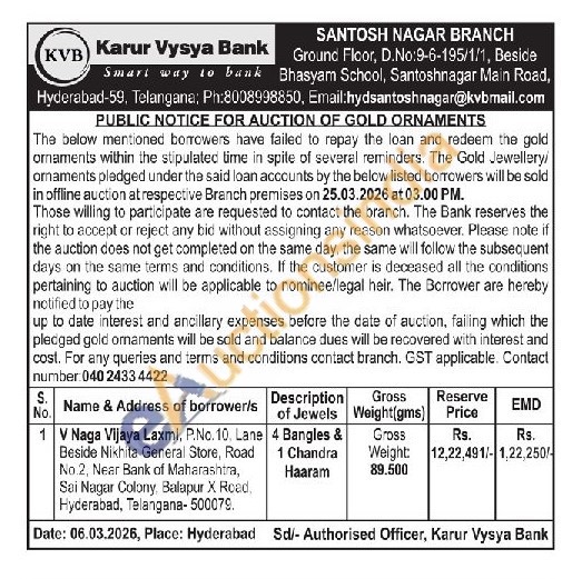 Karur Vysya Bank Gold Auctions Auction in Hyderabad