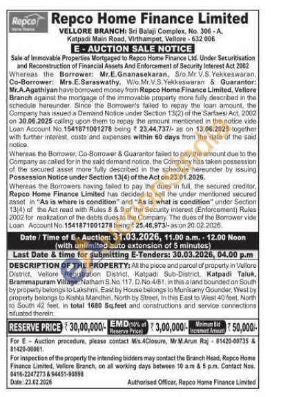 DESCRIPTION OF THE PROPERTY: All the piece and parcel of property in Vellore District, Vellore Registration District, Katpadi Sub-District, Katpadi Taluk, Brammapuram Village, Natham S.No. 117, D.No 4/81, in this a land bounded on South by property belongs to Lakshmi, East by House belongs to Munisamy Gounder, West by property belongs to Kishta Mandhiri, North by Street, In this East to West 40 feet, North to South 42 feet, in total 1680 Sq.feet and constructions and service connections situated therein
