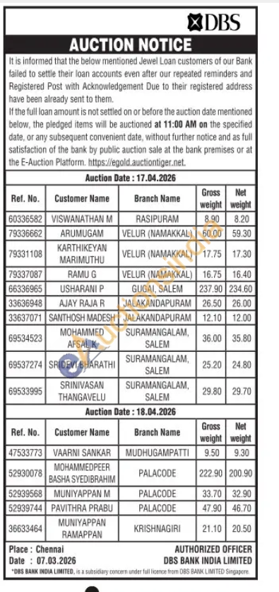 DBS Bank India Limited Gold Auctions Auction in Vellore