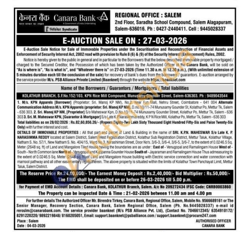 All that part and parcel of Land & Building in the name of SRI. K.P.N. MAHESWAR S/o Late K. P. NARASIMMA REDDY located at Salem District, Salern West Registration District, Kolathur Sub Registration District, Mettur Taluk, Kolathur Village, Natham S. No. 57/1, New Natham S. No. 404/15, Ward No.3, Narashiman Street, Door No's. 3/6-3, 3/6-4, 3/6-5, 3/6-7, to the extent of 0.0246.5 Sq. Meter (2648 sq. ft) of Land and Mangalore Tiled House having the boundaries are as under: East of - Venugopal and Ramalingam House West of -South-North Common lane North of - Venugopal and Kuppanna Gounder House South of-Jayaraman and Ramalingam House Thus admeasuring to the extent of 0.0246.5 Sq. Meter (2648 sq. ft) of Land and Mangalore House building with Electric service connection and water connection with mamool pathway and all other easementary rights therein. The above property is situated within the limits of Kolathur Town Panchayat Limit, Mettur Taluk, Salem District