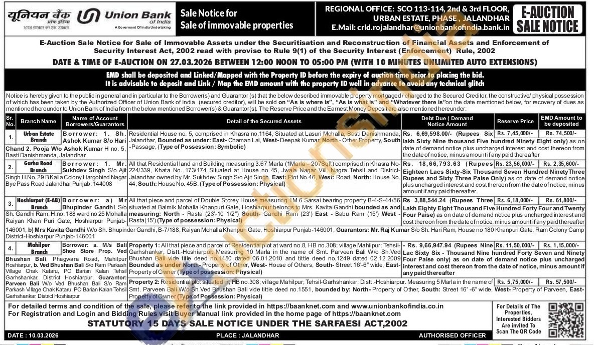 Residential plot situated in, HB no. 308, village Mahilpur; Tehsil-Garhshankar, Distt.-Hoshiarpur Barian Kalan Tehsil Smt. Parveen Bali W/o Sh. Ved Bhushan Bali vide tittle deed no.1551, bounded by: North-Property of Property of Owner (Type of Possession: Physical)