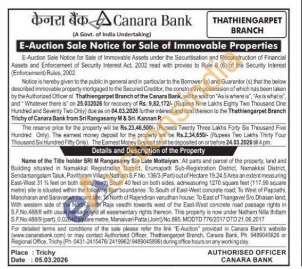 Name of the Title holder SRI M Rangasamy Sio Late Mottaiyan: All parts and parcel of the property, land and Building situated in Namakkal Registration District, Erumapatti Sub-Registration District, Namakkal District, Sendamangalam Taluk, Pavithiram Village Natham S.F.No. 136/3 (Part) out of Hectare 19.24.5 Area an extent measuring East-West 31% feet on both sides, North South 40 feet on both sides, admeasuring 1270 square feet (117.99 square metre) site is situated within the following four boundaries To South of East-West concrete road; To West of Pappathi, Manoharan and Saravanan vacant site, To North of Rajendiran varudhan house, To East of Thangavel Sio Dhasan land, With western side of the North-South Raja veedhi towards west of the East-West concrete road passage rights in S.F.No.488/8 with usual passage and all easementary rights thereon. This property is now under Natham Nilla thittam S.F.No.488/9 (part), 0.02640 square metre, Manaivari Patta (Joint) No.895. MODTD 776/2017 DTD 21.06.2017