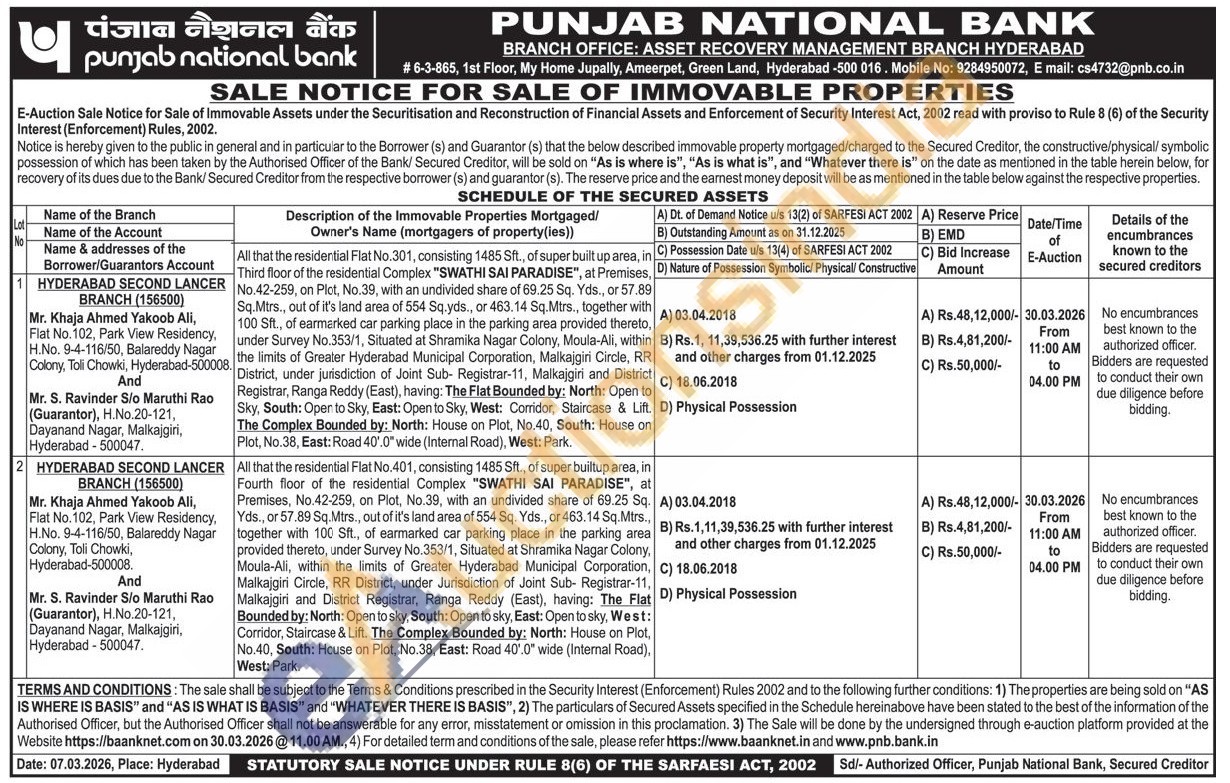 All that the residential Flat No.401, consisting 1485 Sft., of super builtup area, in Fourth floor of the residential Complex "SWATHI SAI PARADISE", at Premises, No.42-259, on Plot, No.39, with an undivided share of 69.25 Sq. Yds., or 57.89 Sq.Mtrs., out of it's land area of 554 Sq. Yds., or 463.14 Sq.Mtrs., together with 100 Sft., of earmarked car parking place in the parking area provided thereto, under Survey No.353/1, Situated at Shramika Nagar Colony, Moula-Ali, within the limits of Greater Hyderabad Municipal Corporation, Malkajgiri Circle, RR District, under Jurisdiction of Joint Sub- Registrar-11, Malkajgiri and District Registrar, Ranga Reddy (East), having: The Flat Bounded by: North: Open to sky, South: Open to sky, East: Opentosky, West: Corridor, Staircase & Lift. The Complex Bounded by: North: House on Plot, No.40, South: House on Plot, No.38, East: Road 40'.0" wide (Internal Road), West: Park