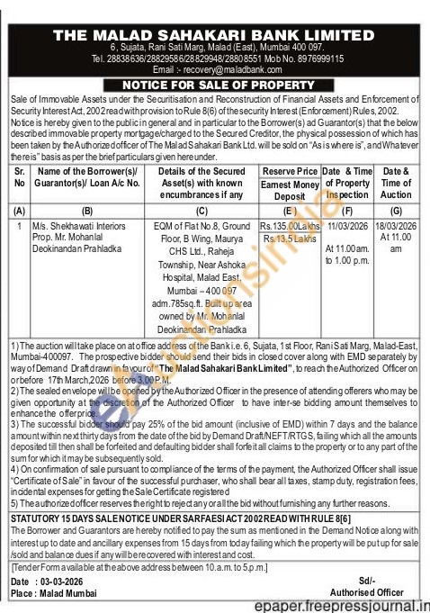 EQM of Flat No.8, Ground Floor, B Wing, Maurya CHS Ltd., Raheja Township, Near Ashoka Hospital, Malad East, Mumbai-400 097 adm.785sq.ft. Built up area owned by Mr. Mohanlal Deokinandan Prahladka