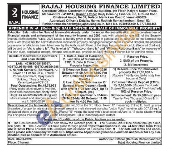 Description of the Immovable Property: Flat No 3C in the 3rd Floor, Tower 17 measuring 811 sqft, built up area (inclusive of proportionate share in common areas) in multi storeyed complex "Lotus Pond" together with 307.23 sq ft, Undivided share in the porperty No. 46, Thaiyur "B" village the land with a total extent of Acre 11.17 cents situate within the Thiruporur Panchayat Union Limits, Chengalpattu Taluk, Kancheepuram District.