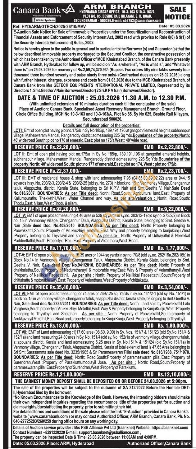 EMT of open plot admeasuring 16.39 ares or 1944 sq yards in sy.no. 70/8 (old sy.no. 282/16a,282/16b) in Block No.14 In Venmoney Village, Chengannur Taluk, Alappuzha District, Kerala State, belonging to Smt. Geetha V. Nair, Sale deed Doc. No.941/2010. BOUNDARIES: As per Title deed: North: Property of chakkalethu, South: Property of Nedumtharayil & motorable way, East: Way & Property of Velamtharayil, West :Property of Nellikkal Padeettathil. As per site: North: Property of Nellikkal Padeettathil, South: Property of chittakattu & motorable way, East: Property of Velenthara, West: Property of chittakattu.