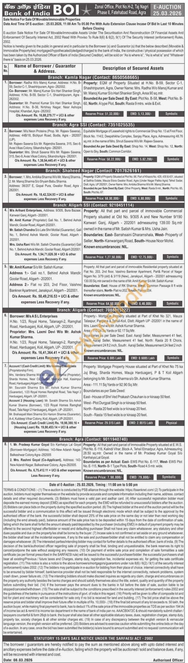 Property: Mortgage Property situated at Part of Khet No 321, Mauza Talaspur, Pargana & Tehsil-Koil, Distt: Aligarh UP-202001 in the name of Mrs. Laxmi Devi w/o Mr. Ashok Kumar Sharma. Area: 110.24 Sq Yards or 92.17 Sq Mtr. Boundaries as per Sale Deed: East: Aaraji Seller, Measurement 41 feet, West: Aaraji Seller, Measurement 41 feet, North: Rasta 20 ft Chora, Measurement 24 ft 2 inch, South: Aaraji Seller, Measurement 24 feet 2 inch