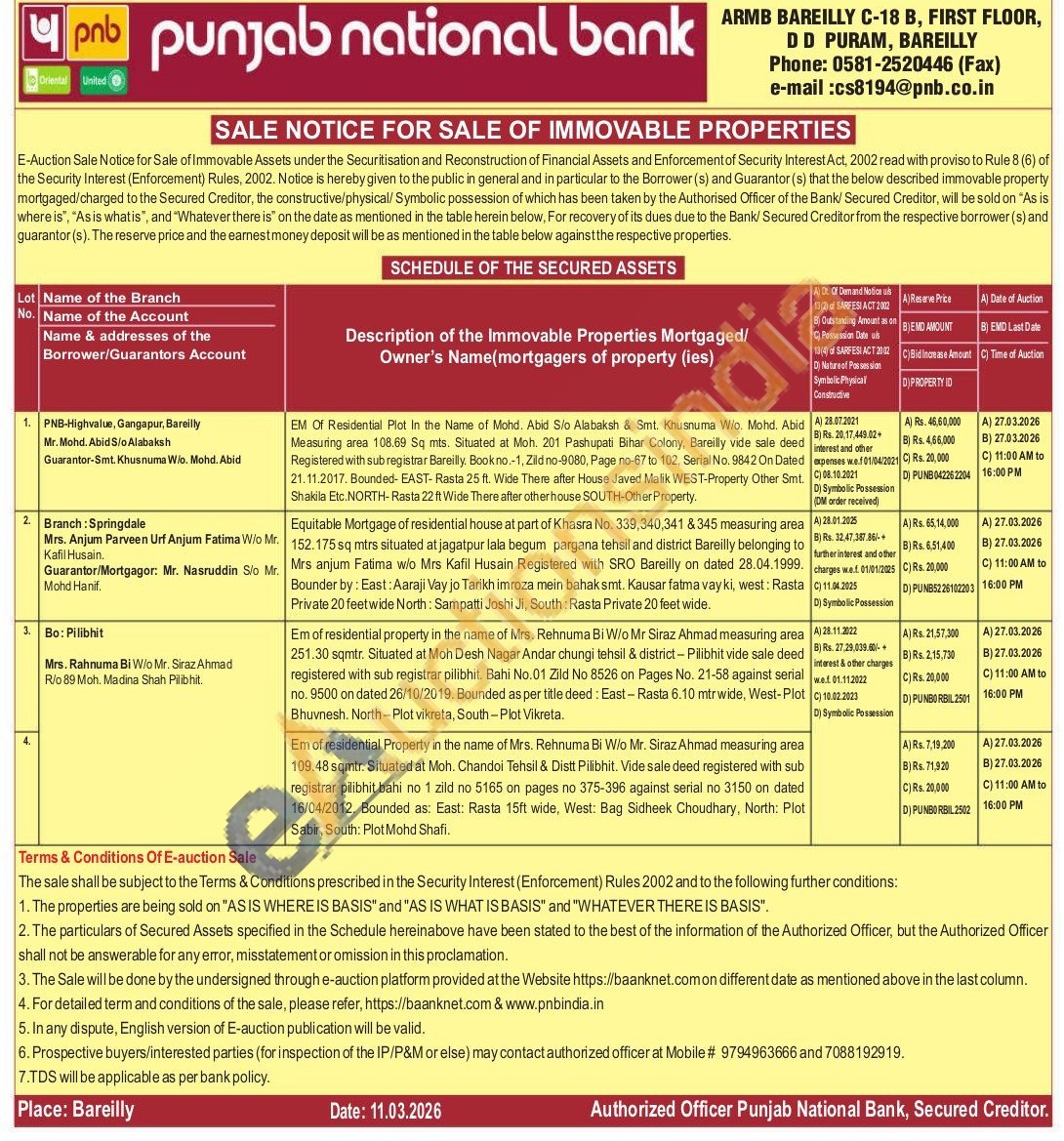 Em of residential Property in the name of Mrs. Rehnuma Bi W/o Mr. Siraz Ahmad measuring area 109.48 sqmtr. Situated at Moh. Chandoi Tehsil & Distt Pilibhit. Vide sale deed registered with sub registrar pilibhit bahi no 1 zild no 5165 on pages no 375-396 against serial no 3150 on dated 16/04/2012. Bounded as: East: Rasta 15ft wide, West: Bag Sidheek Choudhary, North: Plot Sabir, South: Plot Mohd Shafi.