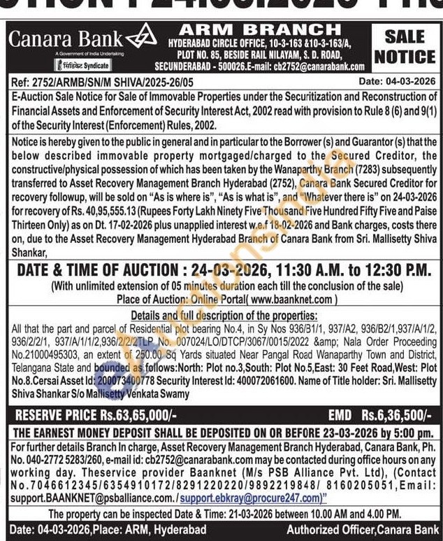 All that the part and parcel of Residential plot bearing No.4, in Sy Nos 936/31/1, 937/A2, 936/B2/1,937/A/1/2, 936/2/2/1, 937/A/1/1/2,936/2/2/2TLP No. 007024/LO/DTCP/3067/0015/2022 & Nala Order Proceeding No.21000495303, an extent of 250.00 Sq Yards situated Near Pangal Road Wanaparthy Town and District, Telangana State and bounded as follows: North: Plot no.3, South: Plot No.5, East: 30 Feet Road, West: Plot No.8.Cersai Asset Id: 200073400778 Security Interest Id: 400072061600. Name of Title holder: Sri. Mallisetty Shiva Shankar S/o Mallisetty Venkata Swamy