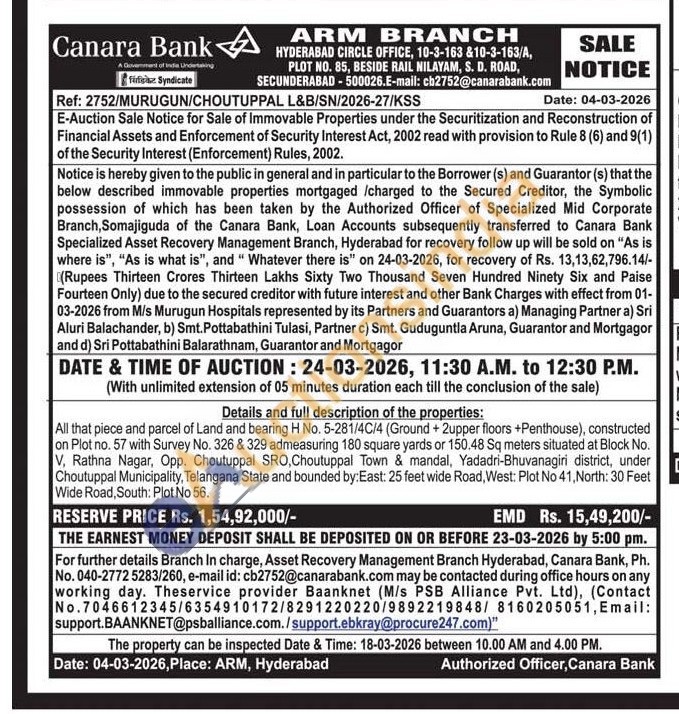 Contact no : 040-2772 5283/260, e-mail id: cb2752@canarabank.com
