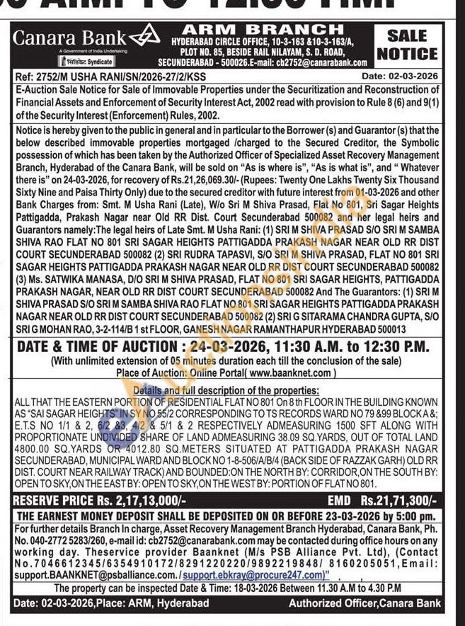 Contact no : 040-2772 5283/260, e-mail id: cb2752@canarabank.com