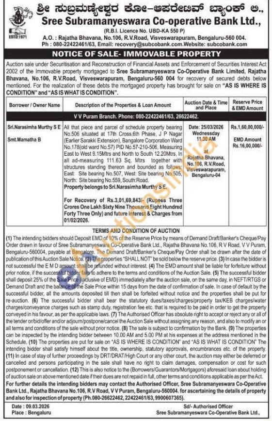 All that piece and parcel of schedule property bearing No.506 situated at 17th Cross, 6th Phase, JP Nagar (Earlier Sarakki Extension), Bangalore Corporation Ward No.178(old ward No.57) PID No.57-210-506, Measuring East to West 9.15Mtrs and North to South 12.20Mtrs, In all ad-measuring 111.63 Sq. Mtrs together with structures standing thereon and bounded as follows: East Site bearing No.507, West: Site bearing No.505, North: Site bearing No.559, South Road. Property belongs to Sri. Narasimha Murthy SE