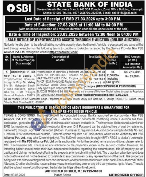Hypothecation of Mahindra & Mahindra Ltd. Truck No. HP-68C-9677, Chassis No. MA1TDARXFN6F71374, Engine No. PANZF13329, Model 2022 Registration Date: 20.10.2022, Vehicle Class: Goods Carrier, Body Type: Open Tipper and Maker/Model : BLAZO28 TP BS6 42 BG 16B Registered in the name of M/s New Thullel Valley, through its Proprietor Sh. Vishay S/o Sh. Mahender Singh-Under Physical Possession Since 12.02.2024