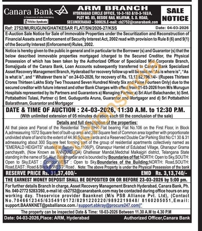 All that piece and Parcel of the Residential Three BHK Flat bearing Flat No.106 on the First Floor, in Block A,admeasuring 1072 Square feet of built-up area and 288 Square feet of Common area together with proportionate undivided share of land to the extent of 44.90 Square yards and a Reserved Double Car Parking Slot No C1 30 & 31 admeasuring about 300 Square feet forming part of the group of residential apartments collectively named as "EMERALD HEIGHTS" situated at Survey No.1106(P), Ghanapur Hamlet of Edulabad Village, Ghanapur Grama panchayath, (Now Known as ANNOJIGUDA) Ghatkesar Mandal, Medchal Malkajgiri district, Telangana State standing in the name of Sri. Aluri Balachandar and is bounded by: Boundaries of flat: NORTH: Open to Sky, SOUTH: Open to Sky,EAST: Corridor, WEST: Open to Sky.Boundaries of the Building: NORTH: Road, SOUTH: Road, EAST: Road & Block B,WEST: Road. Note: The above Property is under the Physical Possession of the bank