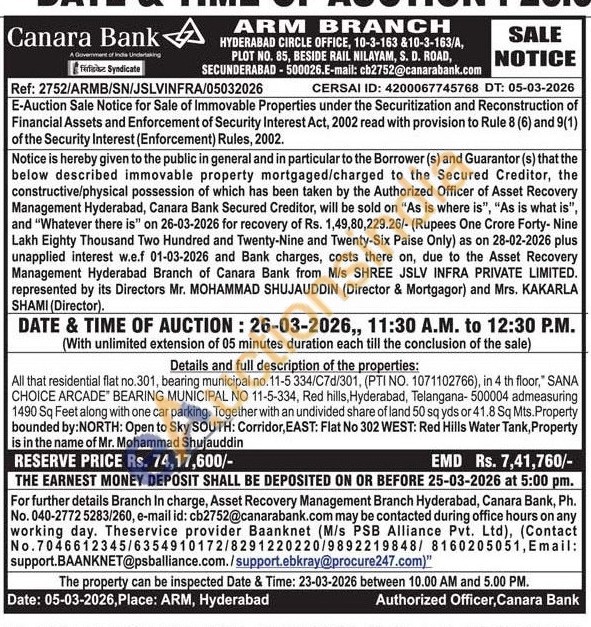 All that residential flat no.301, bearing municipal no. 11-5 334/C7d/301, (PTI NO. 1071102766), in 4 th floor," SANA CHOICE ARCADE BEARING MUNICIPAL NO 11-5-334, Red hills, Hyderabad, Telangana-500004 admeasuring 1490 Sq Feet along with one car parking. Together with an undivided share of land 50 sq yds or 41.8 Sq Mts. Property bounded by:NORTH: Open to Sky SOUTH: Corridor, EAST: Flat No 302 WEST: Red Hills Water Tank, Property is in the name of Mr. Mohammad Shujauddin