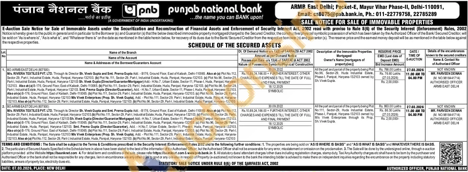 MR. PARVEEN DEWAN (Μobile No : 9818441714) AUTHORISED OFFICER ARMB EAST DELHI