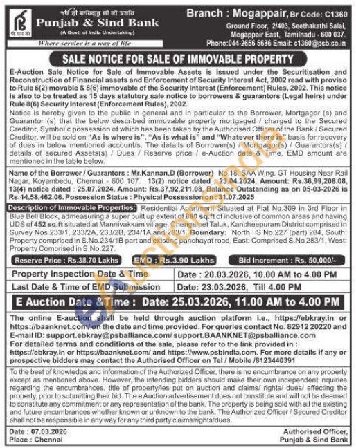 Blue Bell Block, admeasuring a super built up extent of 880 sq.ft of inclusive of common areas and having UDS of 452 sq.ft situated at Mannivakkam village, Chengelpet Taluk, Kancheepuram District comprised in Survey Nos 233/1, 233/2A, 233/2B, 234/1A and 283/1. Boundary: North: S No.227 (part) 284, South: Property comprised in S.No.234/18 part and existing panchayat road, East: Comprised S.No 283/1, West: Property Comprised in S.No.227