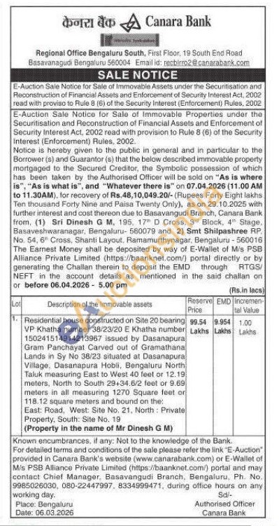 Residential house constructed on Site 20 bearing VP Khatha number 38/23/20 E Khatha number 150241514914213967 issued by Dasanapura Gram Panchayat Carved out of Gramathana Lands in Sy No 38/23 situated at Dasanapura Village, Dasanapura Hobli, Bengaluru North Taluk measuring East to West 40 feet or 12.19 meters, North to South 29+34.6/2 feet or 9.69 meters in all measuring 1270 Square feet or 118.12 square meters and bound on the: East: Road, West: Site No. 21. North Private Property, South: Site No. 19 (Property in the name of Mr Dinesh G M)