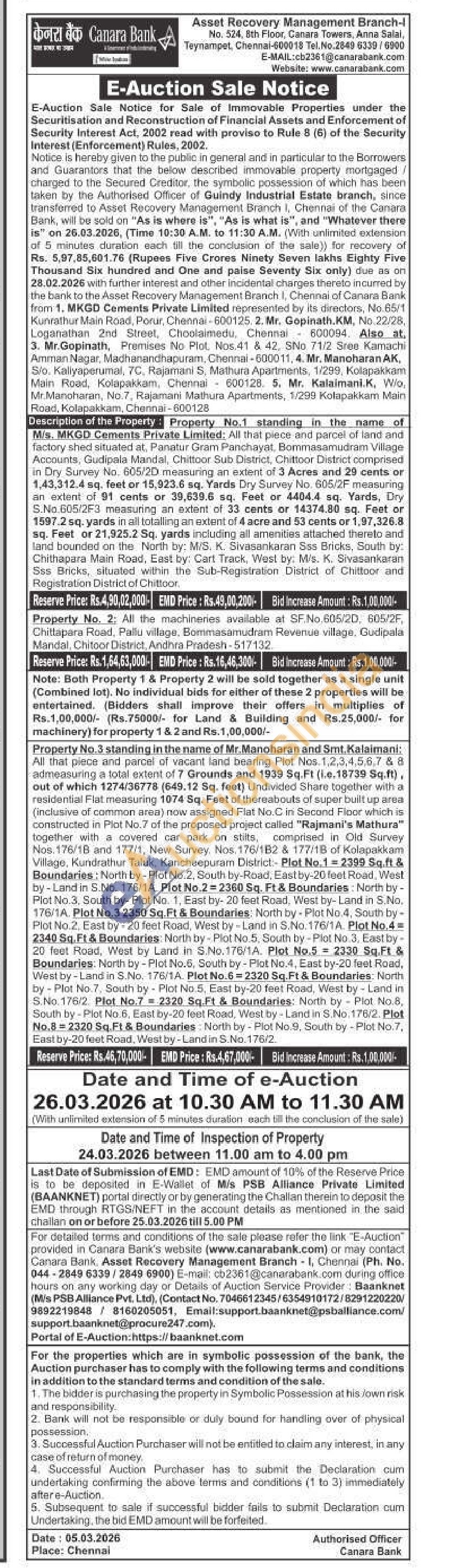Property No.1 standing in the name of Mis. MKGD Cements Private Limited: All that piece and parcel of land and factory shed situated at, Panatur Gram Panchayat, Bommasamudram Village Accounts, Gudipala Mandal, Chittoor Sub District, Chittoor District comprised in Dry Survey No. 605/2D measuring an extent of 3 Acres and 29 cents or 1,43,312.4 sq. feet or 15,923.6 sq. Yards Dry Survey No. 605/2F measuring an extent of 91 cents or 39,639.6 sq. Feet or 4404.4 sq. Yards, Dry S.No.605/2F3 measuring an extent of 33 cents or 14374.80 sq. Feet or 1597.2 sq. yards in all totalling an extent of 4 acre and 53 cents or 1,97,326.8 sq. Feet or 21,925.2 Sq. yards including all amenities attached thereto and land bounded on the North by: M/S. K. Sivasankaran Sss Bricks, South by: Chithapara Main Road, East by: Cart Track, West by: M/s. K. Sivasankaran Sss Bricks, situated within the Sub-Registration District of Chittoor and Registration District of Chittoor