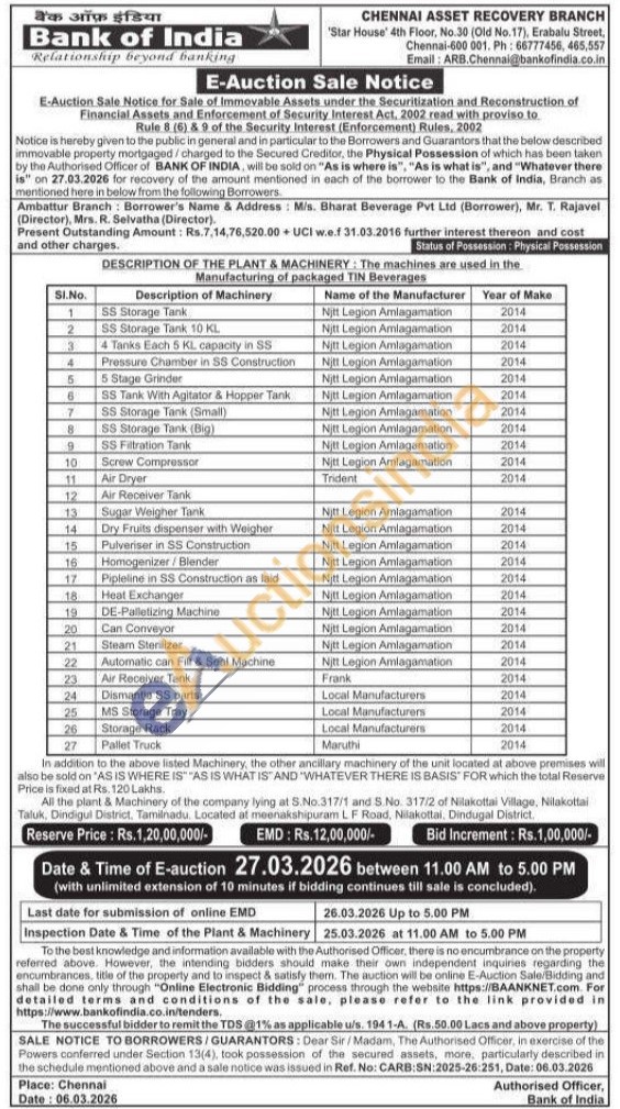 All the plant & Machinery of the company lying at S.No.317/1 and S.No. 317/2 of Nilakottai Village, Nilakottai Taluk, Dindigul District, Tamilnadu. Located at meenakshipuram LF Road, Nilakottai, Dindugal District