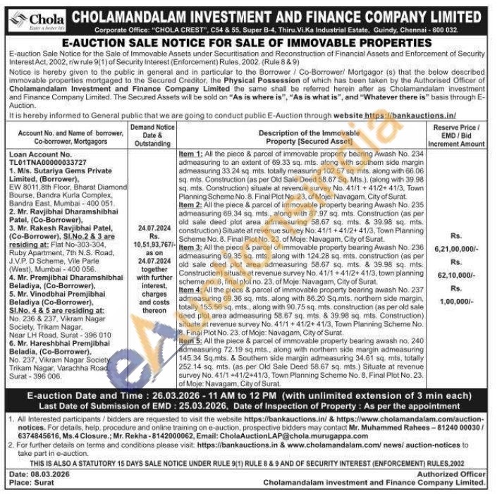 Item 1: All the piece & parcel of immovable property bearing Awash No. 234 admeasuring to an extent of 69.33 sq. mts along with southem side margin admeasuring 33.24 sq mts. totally measuring 102.57 sq. mts, along with 66.06 sq mts. Construction (as per Old Sale Deed 58.67 Sq. Mts.), (along with 39.98 sq. mts. Construction) situate at revenue survey No. 41/1 +41/2+41/3, Town Planning Scheme No. 8. Final Plot No. 23, of Moje: Navagam, City of Surat.