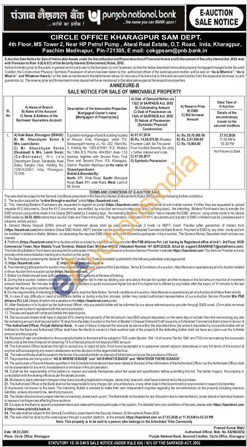 Equitable mongage ofland & building located at Mouza Inda, Kharanpur under PS Narayangarh having J1 No. 232. Ward No. 3, Holding No. 1250-A/700/1, RS. Khatian No. 1284. R.S. Plot No. 404/2541, Ага-1.53 decimal, together with Ground Floor First Floor and Second Floor, PS. Kharagpur Distrid-Paschim Medinipur in the name of Ghanshyam Soren.