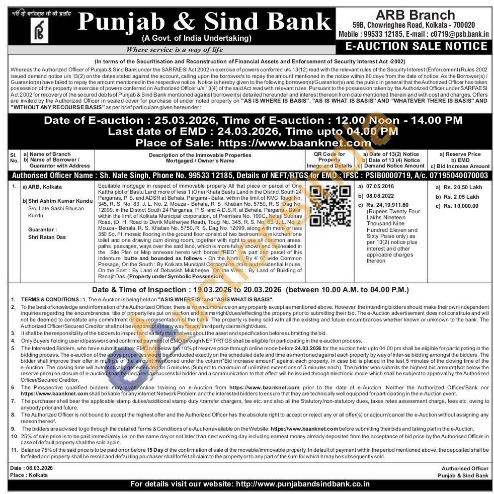 Equitable mortgage in respect of immovable property All that piece or parcel of One Kattha plot of Bastu Land more of less 1 (One) Khata Bastu Land in the District South 24 Parganas, P. S. and ADSR at Behala, Pargana-Balia, within the limit of KMC Tougi No. 345, R. S. No. 83, J. L. No. 2, Mouza Behala, R. S. Khatian No. 5750, R. S. Dag No. 12099, in the District South 24 Parganas, P. S. and A.D.S.R. at Behala, Pargana - Balia, within the limit of Kolkata Municipal corporation, of Premises No. 190C, Netaji Subhas Road, (D. H. Road to Dwrik Mukherjee Road), Tougi No. 345, R. S. No. 83, J. L. No. 2, Mouza-Behala, R. S. Khatian No. 5750, R. S. Dag No. 12099, along with more or less 350 Sq. Ft. mosaic flooring in the ground floor consist of two bedrooms one kitchen, one toilet and one drawing cum dining room, together with right to use all common areas, paths, passages, ways over the said land, which is more fulluy shown and delineated in the Site Plan or Map annexes hereto with border "RED" as part and parcel of this Indenture, butte and bounded as follows On the North By 4' 6" wide Common Passage, On the South: By Kolkata Muncipal Corporation drain and residential House, On the East: By Land of Debasish Mukherjee, On the West: By Land of Building of Ranajit Das. (Property under Symbolic Possession)