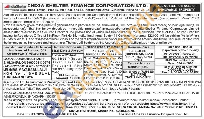 Description Of The Immovable Property/Secured Asset: All Piece And Parcel Of PATTA NO 01 BOOK NO 01 GRAM KILLA GRAM PANCHAYAT BADI GHATI PANCHAYAT SAMITI BHAIRUNDA NAGAUR RAJASTHAN 341031 341031 Rajasthan ADM AREA87 SQ.YD. BOUNDARY:-EAST: House of Mr. Kalyan Mal, WEST: House of Mr. Pukhraj, NORTH: House of Mr. Parsa Ram, South: Road & Passage