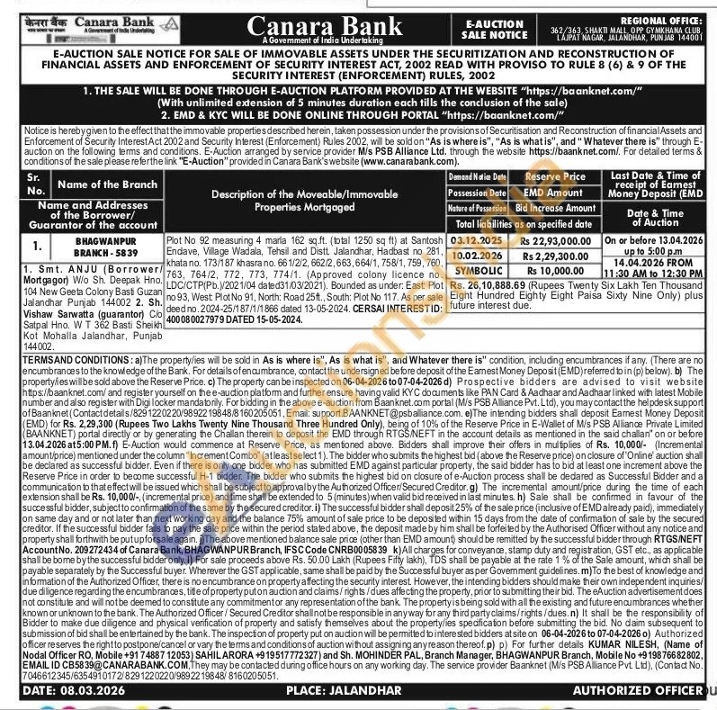 Plot No 92 measuring 4 maria 162 sq.ft. (total 1250 sq ft) at Santosh Endave, Village Wadala, Tehsil and Distt. Jalandhar, Hadbast no 281, khata no. 173/187 khasra no. 661/2/2, 662/2,663,664/1, 758/1, 759, 760, 763, 764/2, 772, 773, 774/1. (Approved colony licence no. LDC/CTP(Pb.)/2021/04 dated31/03/2021). Bounded as under: East Plot no 93, West Plot No 91, North: Road 25ft., South: Plot No 117. As per sale deed no. 2024-25/187/1/1866 dated 13-05-2024. CERSAI INTERESTID: 400080027979 DATED 15-05-2024
