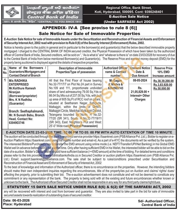 All that the First Floor of house bearing No.32-77/17/7 on Plot No.24 part in Survey No.109 and 111, proportionate undivided share of land admeasuring 79.00 Sq. Yds or 66.04 Sq.Mts out of 237.00 Sq. Yds, with built up area of 605 Sq. Ft of RCC roof on pillars., situated at Seetharam Nagar, Safilguda, Malkajgiri, within the limits of GHMC, Malkajgiri Circle, Medchal-Malkajgiri District, Telangana bounded by North: H No.32-77/20 (SR 341), South: H No.32-77/19/11 (SR 343), East: Neighbor's Plot and West: 25'-0" Wide road (Physical Possession)