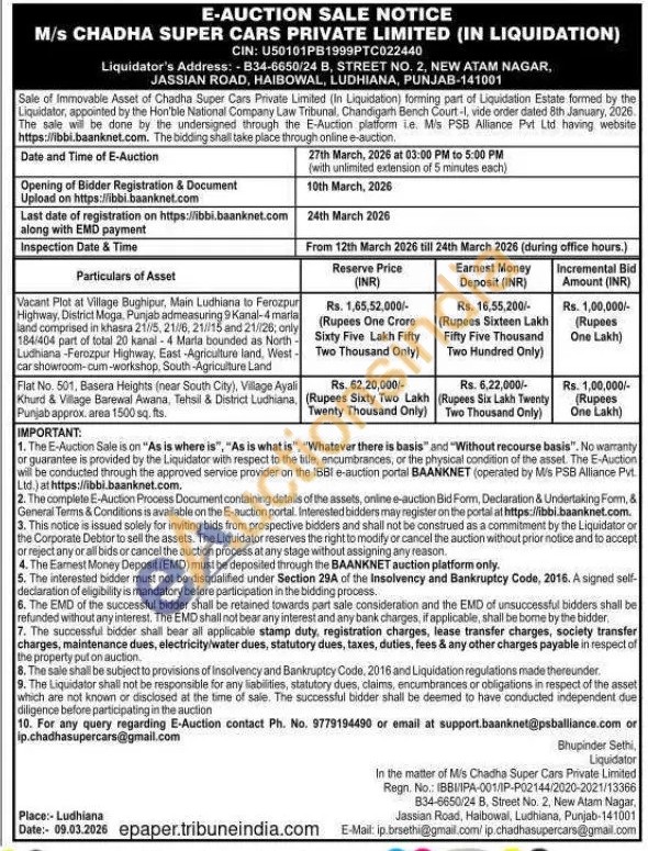 Vacant Plot at Village Bughipur, Main Ludhiana to Ferozpur Highway, District Moga, Punjab admeasuring 9 Kanal-4 maria land comprised in khasra 21//5, 21/6, 21/15 and 21/26; anly 184/404 part of total 20 kanal-4 Marla bounded as North Ludhiana-Ferozpur Highway, East -Agriculture land. West car showroom-cum-workshop, South-Agriculture Land