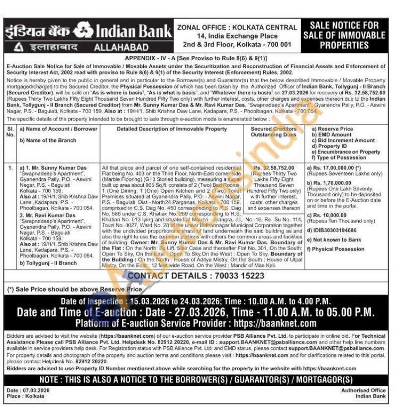 All that piece and parcel of one self-contained residential Flat being No. 403 on the Third Floor, North-East corner side (Marble Flooring) (G+3 Storied building), measuring a super built up area about 965 Sq.ft. consists of 2 (Two) Bed Rooms. 1 (One Dining, 1 (One) Open Kitchen and 2 (Two) Toilet Premises situated at Gyanendra Pally, P.O-Aswini Nagar, P.S.-Bagulati, Dist-North24 Parganas, Kolkata-700 159. comprised in C.S. Dag No. 450 corresponding to R.S. Dag No. 586 under C.S. Khatian No. 269 corresponding to R.S. Khatian No. 513 lying and situated at Mouza - Jyangra, J.L. No. 16. Re. Su No. 114. Touzi No. 3027. Ward No. 28 of the under Bidhannagar Municipal Corporation together with the undivided proportionate share of land underneath the said building as and also the right to use the common portions with others the common areas and facilities of building. Owner: Mr. Sunny Kumar Das & Mr. Ravi Kumar Das. Boundary of the Flat: On the North. By Lift, Stair Case and thereafter Flat No. 301, On the South: Open To Sky. On the East: Open To Sky, On the West: Open To Sky. Boundary of the Building: On the North House of Aditya Mistry, On the South: House of Utpal Mistry, On the East: 12 feet wide Road. On the West: Mandir of Maa Kali