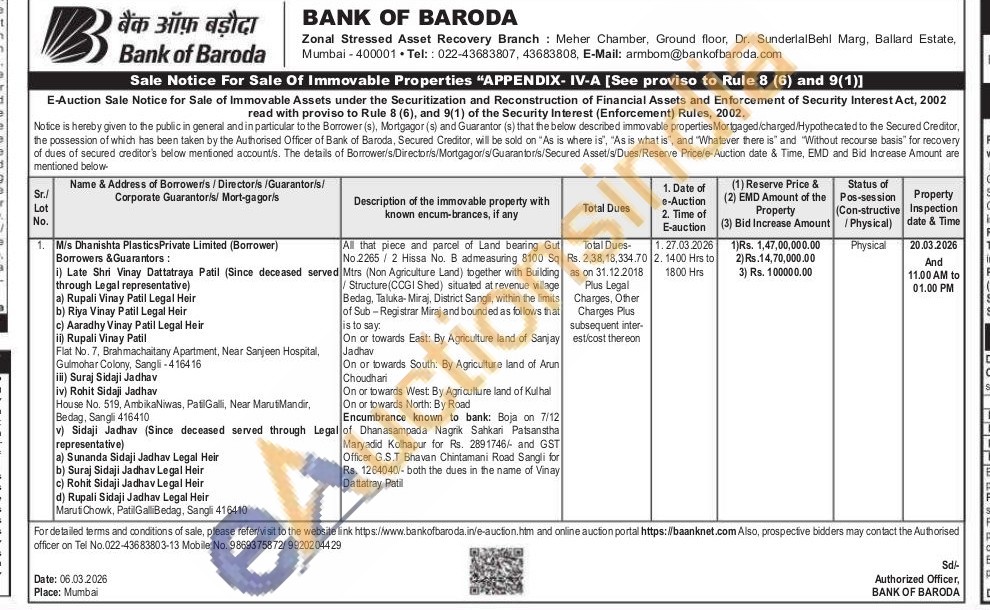 All that piece and parcel of Land bearing Gut No.2265/2 Hissa No. B admeasuring 8100 Sq Mtrs (Non Agriculture Land) together with Building Structure (CCGI Shed) situated at revenue village Bedag, Taluka-Miraj, District Sangli, within the limits of Sub-Registrar Miraj and bounded as follows that
