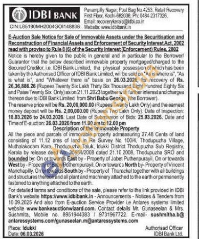 All the piece and parcels of immovable property admeasuring 27.48 Cents of land consisting of 11.12 ares of land in Re Survey No 100/4, Thodupuzha Village, Muthalakodam Kara, Thodupuzha Taluk, Idukki District Thodupuzha Sub Registry, Kerala by release deed No. 3565/1/2008 dated 21.10.2008, Thodupuzha SRO and bounded by: On or towards East by-Property of Jobet Puthenpurayil, On or towards West by-Property of Baby Puthempurayil. On or towards North by-Property of Vincent Manchapilly. On or towards South by-Property of Thurackal together with all buildings and structures thereon and all plant and machinery attached to the earth or permanently fastened to anything attached to the earth