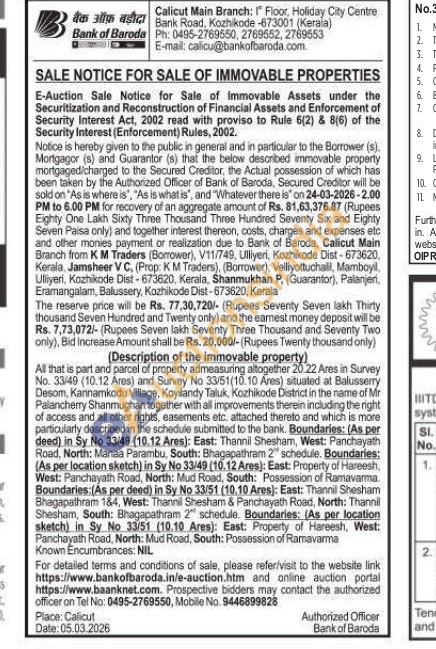 All that is part and parcel of property admeasuring altogether 20.22 Ares in Survey No. 33/49 (10.12 Ares) and Survey No 33/51(10.10 Ares) situated at Balusserry Desom, Kannamkodu Village, Koyilandy Taluk, Kozhikode District in the name of Mr Palancherry Shanmughan together with all improvements therein including the right of access and all other rights, easements etc. attached thereto and which is more particularly described in the schedule submitted to the bank. Boundaries: (As per deed) in Sy No 33/49 (10.12 Ares): East: Thannil Shesham, West: Panchayath Road, North: Manaa Parambu, South: Bhagapathram 2 schedule. Boundaries: (As per location sketch) in Sy No 33/49 (10.12 Ares): East: Property of Hareesh, West: Panchayath Road, North: Mud Road, South: Possession of Ramavarma. Boundaries: (As per deed) in Sy No 33/51 (10,10 Ares): East: Thannil Shesham Bhagapathram 184, West: Thannil Shesham & Panchayath Road, North: Thannil Shesham, South: Bhagapathram 2 schedule. Boundaries: (As per location sketch) in Sy No 33/51 (10.10 Ares): East: Property of Hareesh, West: Panchayath Road, North: Mud Road, South: Possession of Ramavarma Known Encumbrances: NIL