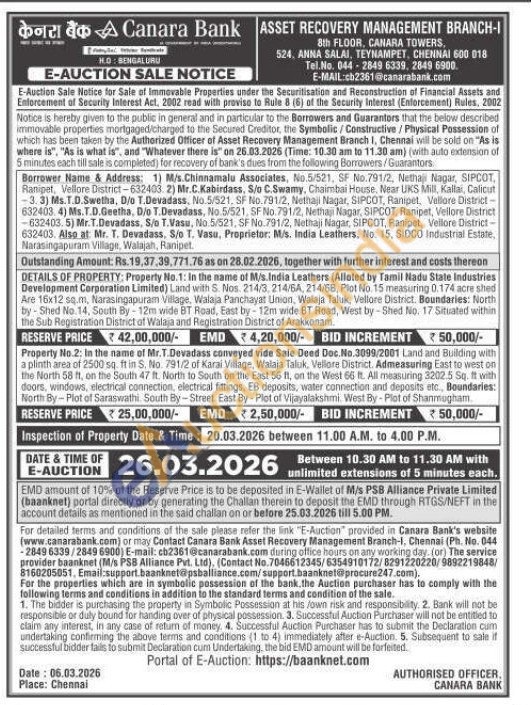 Property No.2: In the name of Mr.T.Devadass conveyed vide Sale Deed Doc.No.3099/2001 Land and Building with a plinth area of 2500 sq. ft in S. No. 791/2 of Karai Village, Walaja Taluk, Vellore District. Admeasuring East to west on the North 58 ft, on the South 47 ft. North to South on the East 56 ft, on the West 66 ft. All measuring 3202.5 Sq. ft with doors, windows, electrical connection, electrical fittings, EB deposits, water connection and deposits etc., Boundaries: North By-Plot of Saraswathi South By-Street. East By-Plot of Vijayalakshmi. West By-Plot of Shanmugham
