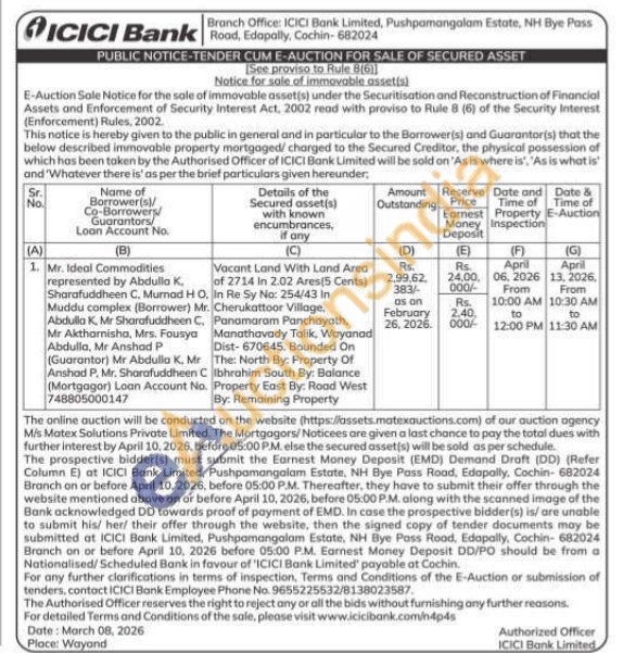 Vacant Land With Land Area of 2714 In 2.02 Ares (5 Cents) In Re Sy No: 254/43 in Cherukattoor Village, Panamaram Panchayath, Manathavady Talik, Wayanad Dist-670645. Bounded On The: North By: Property Of Ibhrahim South By: Balance Property East By: Road West By: Remaining Property