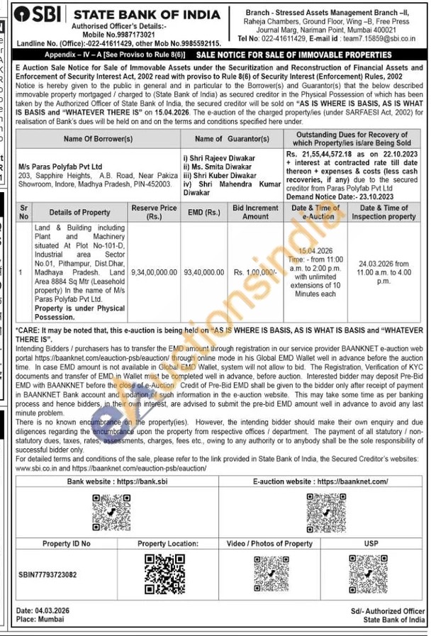 Land & Building including Plant and Machinery situated At Plot No-101-D, Industrial area Sector No 01, Pithampur, Dist Dhar, Madhaya Pradesh Land Area 8884 Sq Mtr (Leasehold property) In the name of Mis Paras Polyfab Pvt Ltd. Property is under Physical Possession.