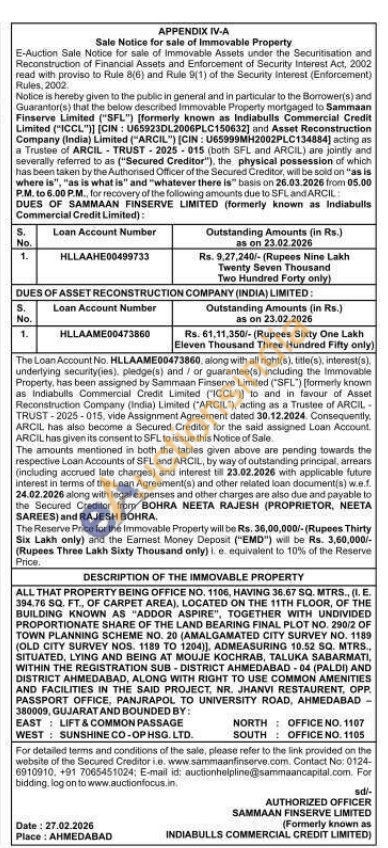 ALL THAT PROPERTY BEING OFFICE NO, 1106, HAVING 36.67 SQ. MTRS., (1. E. 394.76 SQ. FT., OF CARPET AREA), LOCATED ON THE 11TH FLOOR, OF THE BUILDING KNOWN AS "ADDOR ASPIRE", TOGETHER WITH UNDIVIDED PROPORTIONATE SHARE OF THE LAND BEARING FINAL PLOT NO. 290/2 OF TOWN PLANNING SCHEME NO. 20 (AMALGAMATED CITY SURVEY NO. 1189 (OLD CITY SURVEY NOS. 1189 ΤΟ 1204)), ADMEASURING 10.52 SQ. MTRS.. SITUATED, LYING AND BEING AT MOUJE KOCHRAB, TALUKA SABARMATI, WITHIN THE REGISTRATION SUB-DISTRICT AHMEDABAD-04 (PALDI) AND DISTRICT AHMEDABAD, ALONG WITH RIGHT TO USE COMMON AMENITIES AND FACILITIES IN THE SAID PROJECT, NR. JHANVI RESTAURENT, OPP. PASSPORT OFFICE, PANJRAPOL TO UNIVERSITY ROAD, AHMEDABAD 380009, GUJARAT AND BOUNDED BY: EAST LIFT & COMMON PASSAGE WEST SUNSHINE CO-OP HSG. LTD. NORTH OFFICE NO. 1107 SOUTH OFFICE NO. 1105