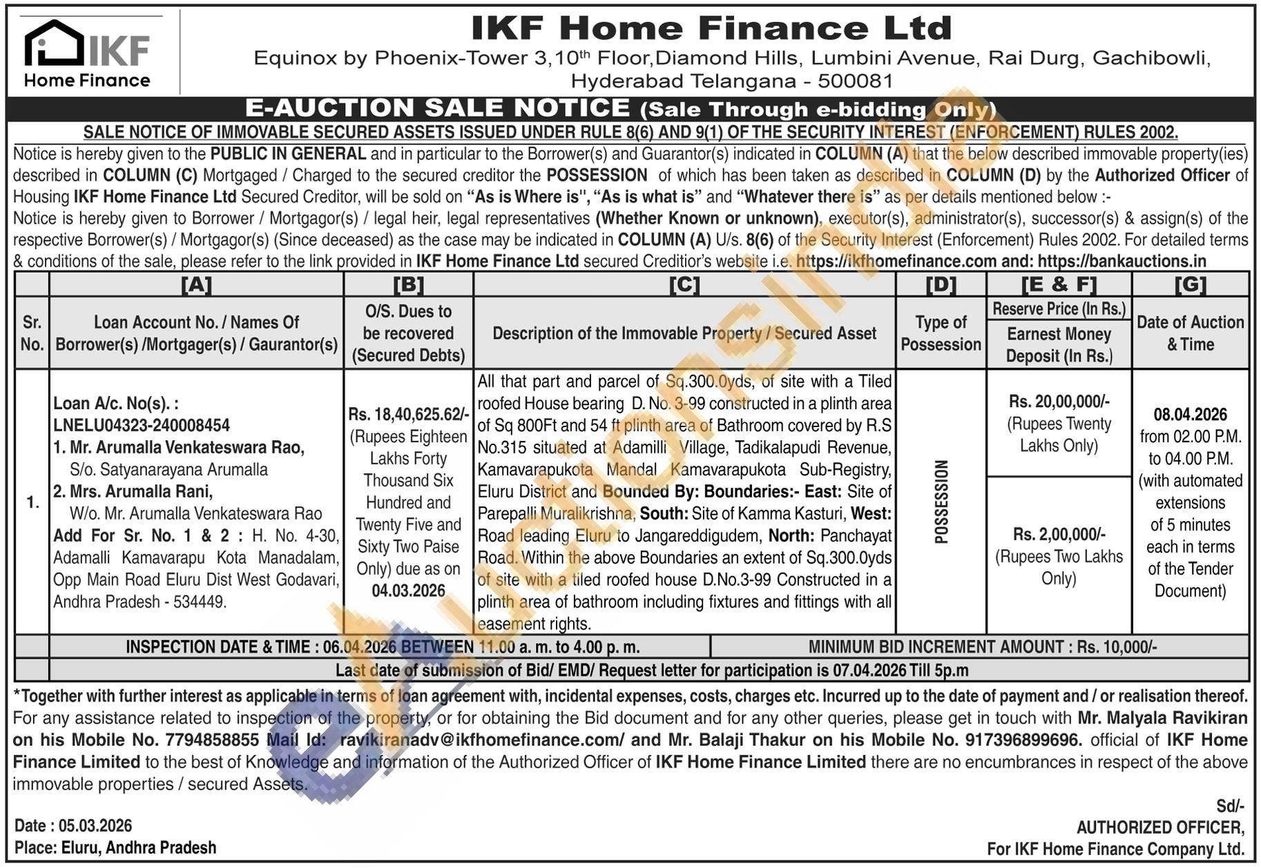 All that part and parcel of Sq.300.0yds, of site with a Tiled roofed House bearing D. No. 3-99 constructed in a plinth area of Sq 800Ft and 54 ft plinth area of Bathroom covered by R.S No.315 situated at Adamilli Village, Tadikalapudi Revenue, Kamavarapukota Mandal Kamavarapukota Sub-Registry, Eluru District and Bounded By: Boundaries:- East: Site of Parepalli Muralikrishna, South: Site of Kamma Kasturi, West: Road leading Eluru to Jangareddigudem, North: Panchayat Road. Within the above Boundaries an extent of Sq.300.0yds of site with a tiled roofed house D.No.3-99 Constructed in a plinth area of bathroom including fixtures and fittings with all easement rights.