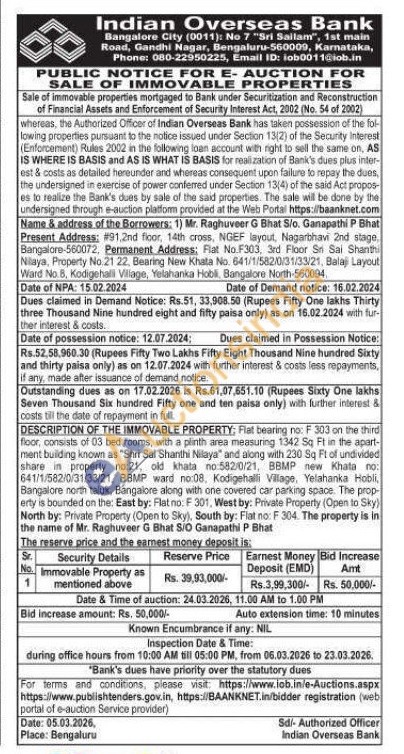 DESCRIPTION OF THE IMMOVABLE PROPERTY; Flat bearing no: F 303 on the third floor, consists of 03 bed rooms, with a plinth area measuring 1342 Sq Ft in the apart-ment building known as "Shri Sai Shanthi Nilaya" and along with 230 Sq Ft of undivided share in property no:21, old khata no 582/0/21, BBMP new Khata no: 641/1/582/0/31/33/21, BBMP ward no:08. Kodigehalli Village, Yelahanka Hobli, Bangalore north taluk, Bangalore along with one covered car parking space. The prop-erty is bounded on the: East by: Flat no. F 301, West by: Private Property (Open to Sky) North by: Private Property (Open to Sky), South by: Flat no: F 304. The property is in the name of Mr. Raghuveer G Bhat S/O Ganapathi P Bhat