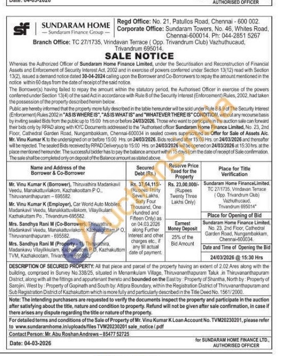 DESCRIPTION OF SECURED PROPERTY: All that piece and parcel of the property having an extent of 2.02 Ares along with the building, comprised in Survey No.338/25, situated in Menamkulam Village, Thiruvananthapuram Taluk in Thiruvananthapuram District, along with all the fittings and appurtenant thereto and bounded on the East by: Property of Shantha, North by Property of Sarojini, West by: Property of Gopinath and South by: Attipra Boundary, within the Registration District of Thiruvananthapuram and Sub Registration District of Kazhakuttom which is more fully and particularly described in the Title Deed No. 1561/2000
