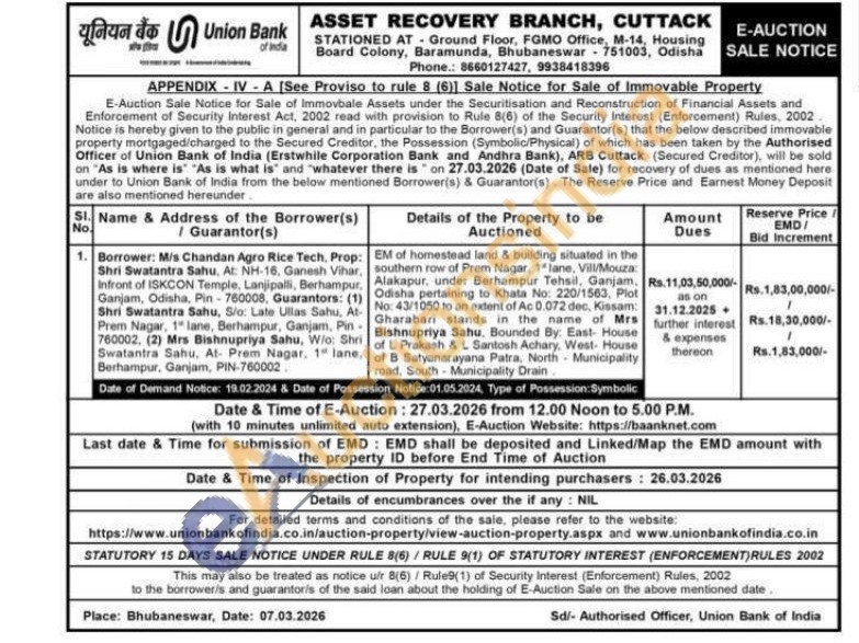 EM of homestead land & building situated in the southern row of Prem Nagar, 1" lane, Vill/Mouza: Alakapur, under Berhampur Tehsil, Ganjam. Odisha pertaining to Khata No: 220/1563, Plot No: 43/1050 to an extent of Ac 0.072 dec, Kissam: Gharabari stands in the name of Mrs Bishnupriya Sahu, Bounded By: East House of L Prakash & L Santosh Achary, West House of B Satyanarayana Patra, North- Municipality road, South Municipality Drain