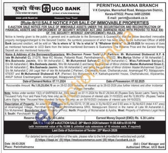 Description of Property: An extent of 01.86 ares in Sy No:53/10, 01.88 ares in Sy No:62/2 and 0.93 ares in Sy No:62/3 (total 4.67 ares) of Anamangad Village, Perinthaimanna Taluk, Perinthalmanna SRO, Malappuram District in the name of Late Mr.Asharafall C Sio Muhammed. Boundaries; East: Property of Firoz, North: Property of Muhamadali & Ayisha, West: Property of Fathima's Legal Hers & South: Panchayath Road