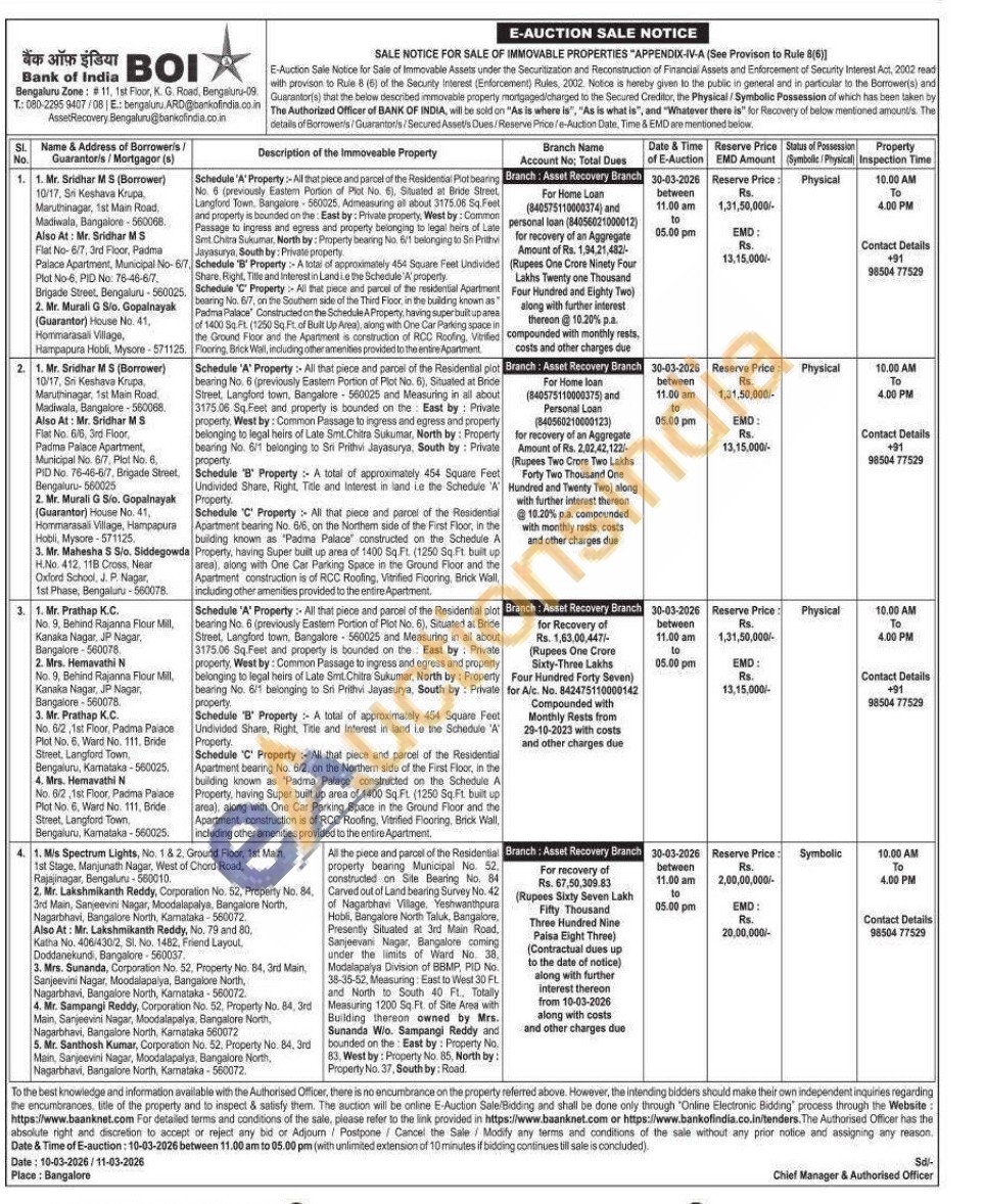 3) All that piece and parcel of the Residential plot bearing No. 6 (previously Eastem Portion of Plot No. 6), Situated at Bride Street, Langford town, Bangalore 560025 and Measuring in all about 3175.06 Sq Feet and property is bounded on the East by: Private property, West by: Common Passage to ingress and egress and property belonging to legal heirs of Late Smt. Chitra Sukumar, North by: Property bearing No. 6/1 belonging to Sri Prithvi Jayasurya, South by: Private property Schedule 'B' Property A total of approximately 454 Square Feet Undivided Share, Right, Title and interest in land Le the Schedule 'A' Property. Schedule 'C' Property: All that piece and parcel of the Residential Apartment bearing No. 6/2, on the Northern side of the First Floor, in the building known as 'Padma Palace" constructed on the Schedule A Property, having Super built up area of 1400 Sq Ft. (1250 Sq. Ft. built up area), along with One Car Parking Space in the Ground Floor and the Apartment construction is of RCC Roofing, Vitrified Flooring, Brick Wall, including other amenities provided to the entire Apartment.