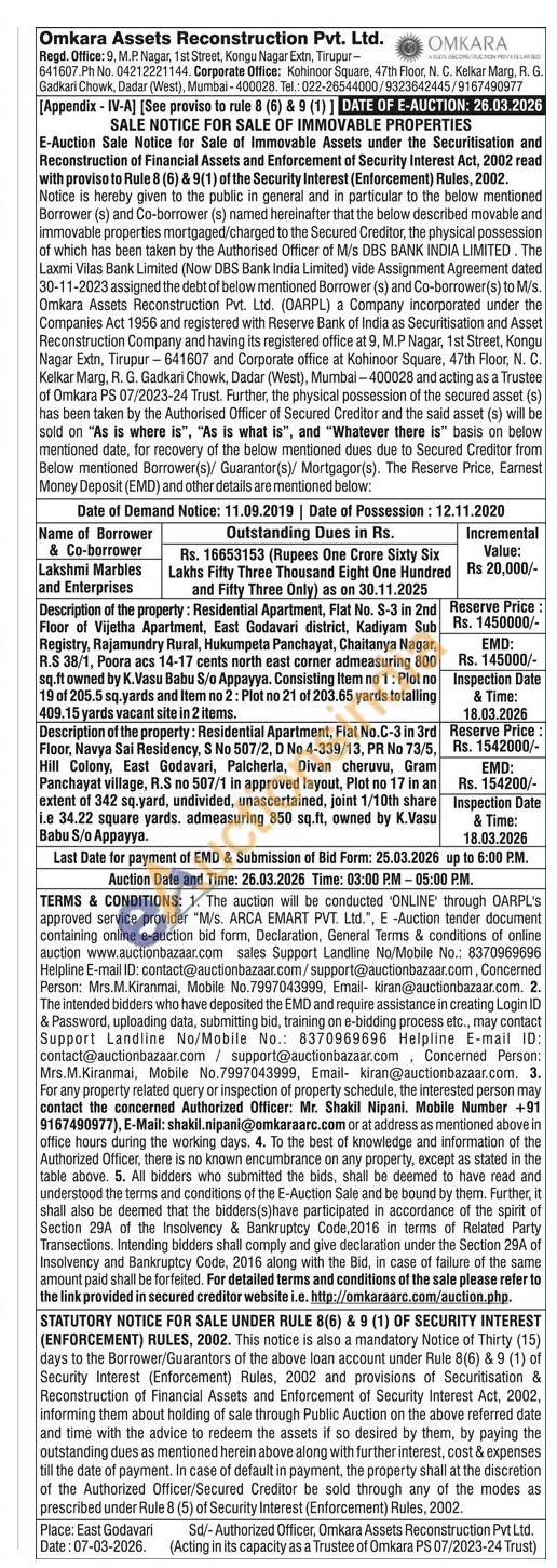 Description of the property: Residential Apartment, Flat No.C-3 in 3rd Floor, Navya Sai Residency, S No 507/2, D No 4-339/13, PR No 73/5, Hill Colony, East Godavari, Palcherla, Divan cheruvu, Gram Panchayat village, R.S no 507/1 in approved layout, Plot no 17 in an extent of 342 sq.yard, undivided, unascertained, joint 1/10th share i.e 34.22 square yards, admeasuring 850 sq.ft, owned by K.Vasu Babu S/o Appayya.