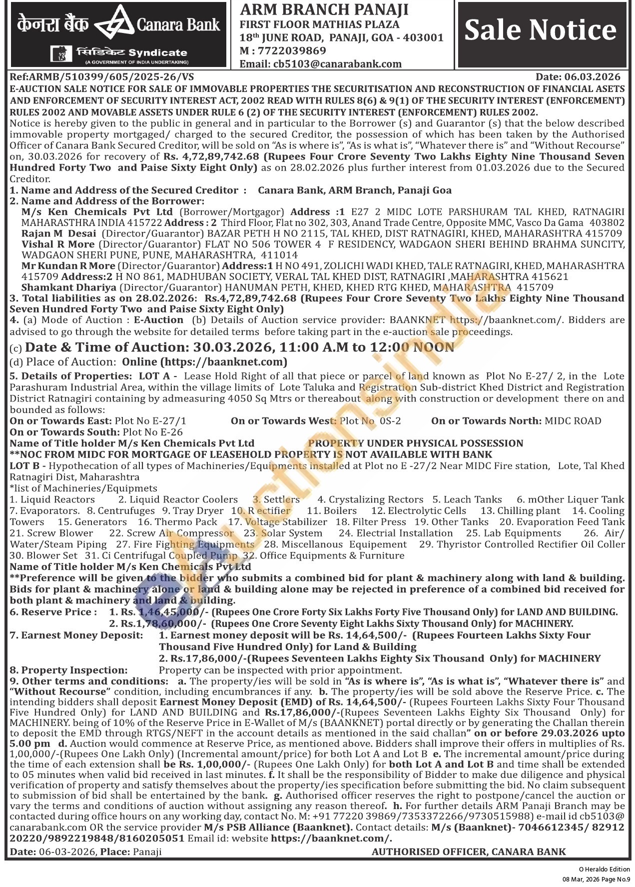LOT B Hypothecation of all types of Machineries/Equipments installed at Plot no E-27/2 Near MIDC Fire station, Lote, Tal Khed Ratnagiri Dist, Maharashtra