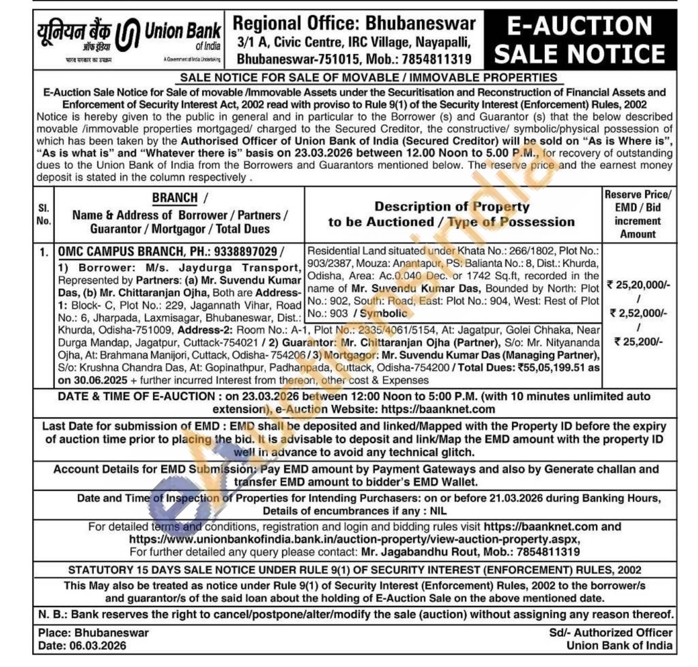 Residential Land situated under Khata No.: 266/1802, Plot No.: 903/2387, Mouza: Anantapur, PS: Balianta No.: 8, Dist.: Khurda, Odisha, Area: Ac.0.040 Dec. or 1742 Sq.ft, recorded in the name of Mr. Suvendu Kumar Das, Bounded by North: Plot No.: 902, South: Road, East: Plot No.: 904, West: Rest of Plot No.: 903 / Symbolic